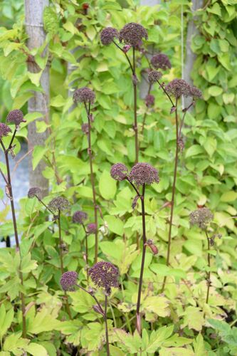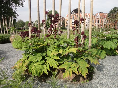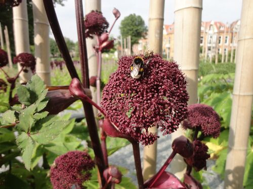 Deze forse plant uit Korea en China wordt manshoog, bloeit rijk met grote schermen diep-wijnrode bloemen, in tegenstelling tot de Europese Angelica archangelica, die witte bloemschermen heeft. Geneeskruid in China. Hier ook fraai als grote tuinplant.
