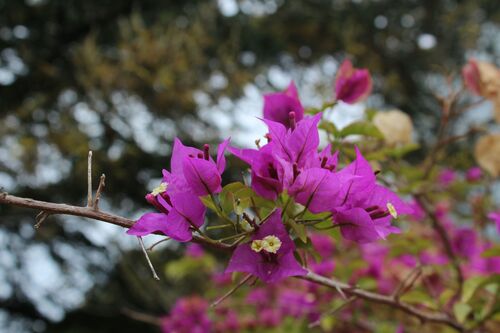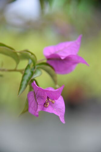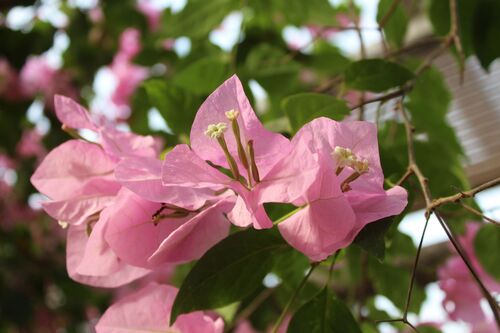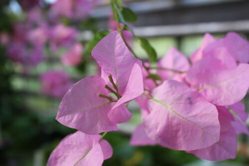 Wat een roze bloem lijkt zijn in werkelijkheid de schutbladen. Ze zijn papierdun en omvatten de onopvallende witte bloemen. De schutbladen lokken insecten en beschermen de bloemen tegen regen. Betalaïnen, wateroplosbare pigmenten, zorgen voor de roze kleur. Er zijn circa zeventien soorten Bougainvillea, afkomstig uit de tropen en subtropen van Zuid-Amerika, vooral Brazilië. Bougainvillea werd voor het eerst gevonden in de tweede helft van de achttiende eeuw, tijdens een expeditie waarover de Franse zeevaarder Louis Antoine de Bougainville de leiding had. Ze zijn in de eerste helft van de negentiende eeuw in Europa ingevoerd. Soorten en kruisingen uit het geslacht worden toegepast als tuin- en kamerplant.