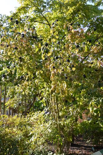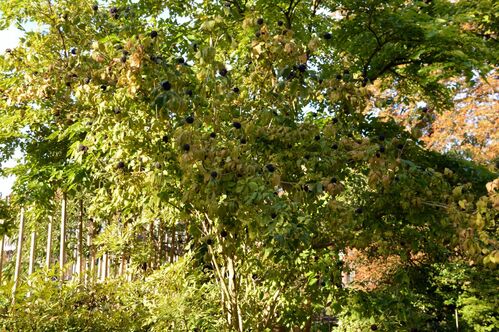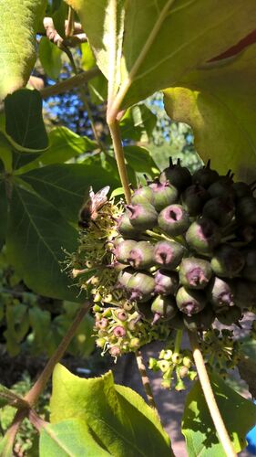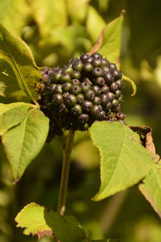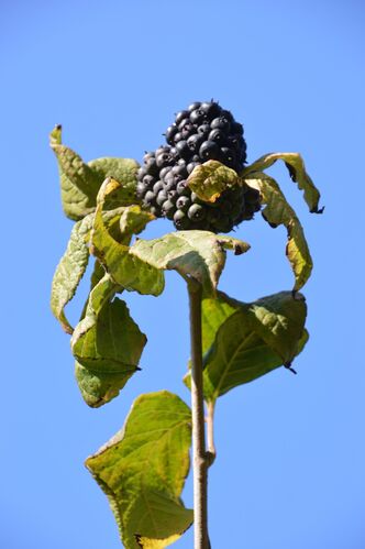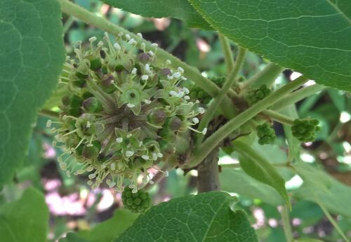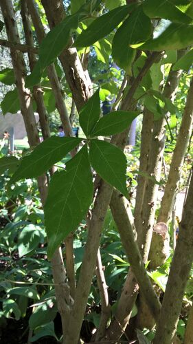 Flinke struik met 3-5 delig blad, die je op het eerste gezicht niet in de Klimopfamile verwacht. De bolvormige bloeiwijzen met kleine wit-gele bloemetjes, maar vooral de dicht opeen staande zwarte bessen lijken juist erg veel op Klimop. Komt uit China, draagt stekels.