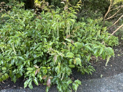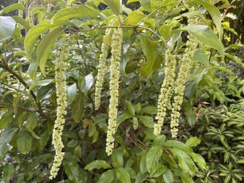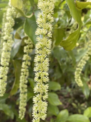 Laag, wintergroen struikje met in juli zoetgeurende, lange trossen piepklein bloemetjes. Uit China.