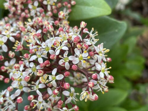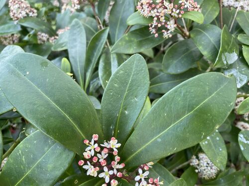 Bekend struikje dat in de Kersttijd veel gebruikt wordt o.m. als snijgroen en in potjes en dan gaat het om de trosjes rode bloemknoppen, òf om de trosjes fel-rode bessen die de vogels niet erg aantrekkelijk vinden. Groenblijvende, laag groeiende tuinheester. Het is een tweehuizige struik uit Japan, die daar Miyamashikimi heet, verlatiniseerd tot Skimmia.