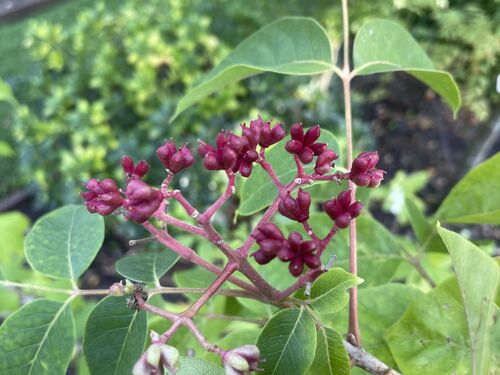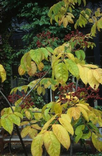 De bijenboom heeft een waaiervormige kroon en meet na tien jaar zo'n vijf meter. De schors is glad en donkergrijs, de fluweelachtig behaarde twijgen olijfgroen, later grijsbruin. De geelwitte bloemen in pluimen worden gevolgd door rood, later zwart gekleurde vruchten. Het blad van zo'n dertig centimeter lang bestaat uit vijf tot negen kortgesteelde deelblaadjes. Het is van boven donkergroen, van onderen lichtgroen. De Duitse botanicus Forster ontdekte de boom in China eind 18e eeuw; ruim een eeuw later werd hij beschreven door de Fransman Dode. Uitstekende drachtplant voor bijen dankzij de bloei in augustus en september. Mooie kleine boom voor een plek als solitair in de tuin. De kroon is transparant waardoor er allerlei planten onder kunnen groeien. De bloei start na een jaar of vier.