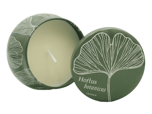 Leuke Hortus Botanicus Leiden kaars in blik. Deze creme kleurige kaars in groen blikje ruikt heerlijk naar bergamot.