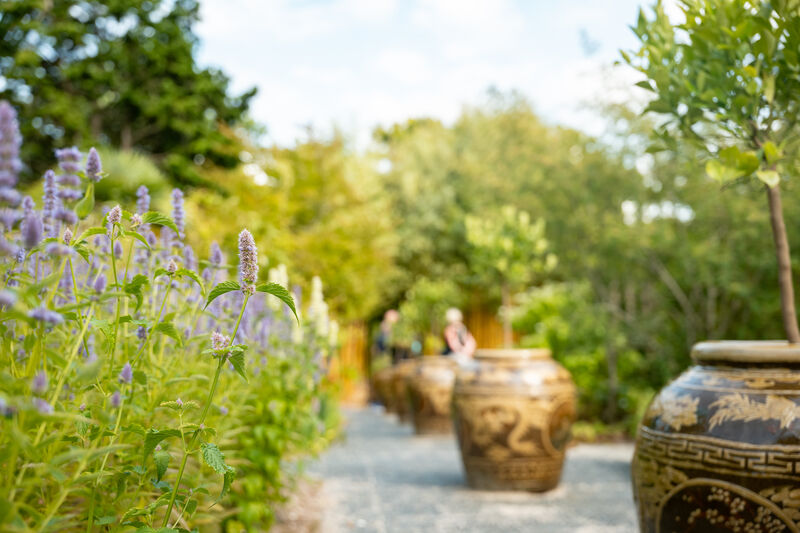 In de tuin valt je oog gelijk op de grote plantenpotten. Deze zijn geïmporteerd uit China. Eigenlijk zijn het geen potten, maar duurzame opslagvaten. Door een gat in de bodem te boren om water te laten weglopen, zijn ze bruikbaar als plantenpotten.